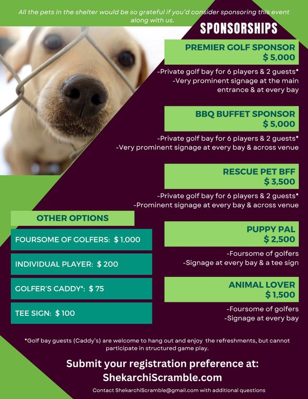 Please register as a Golfer's Caddy to attend, share a few laughs and enjoy the food & drink. There will be great raffles, giveaways and lots of networking. Come for the whole day or just an hour- either way you'll give us the gift of your presence and help support the shelter animals.